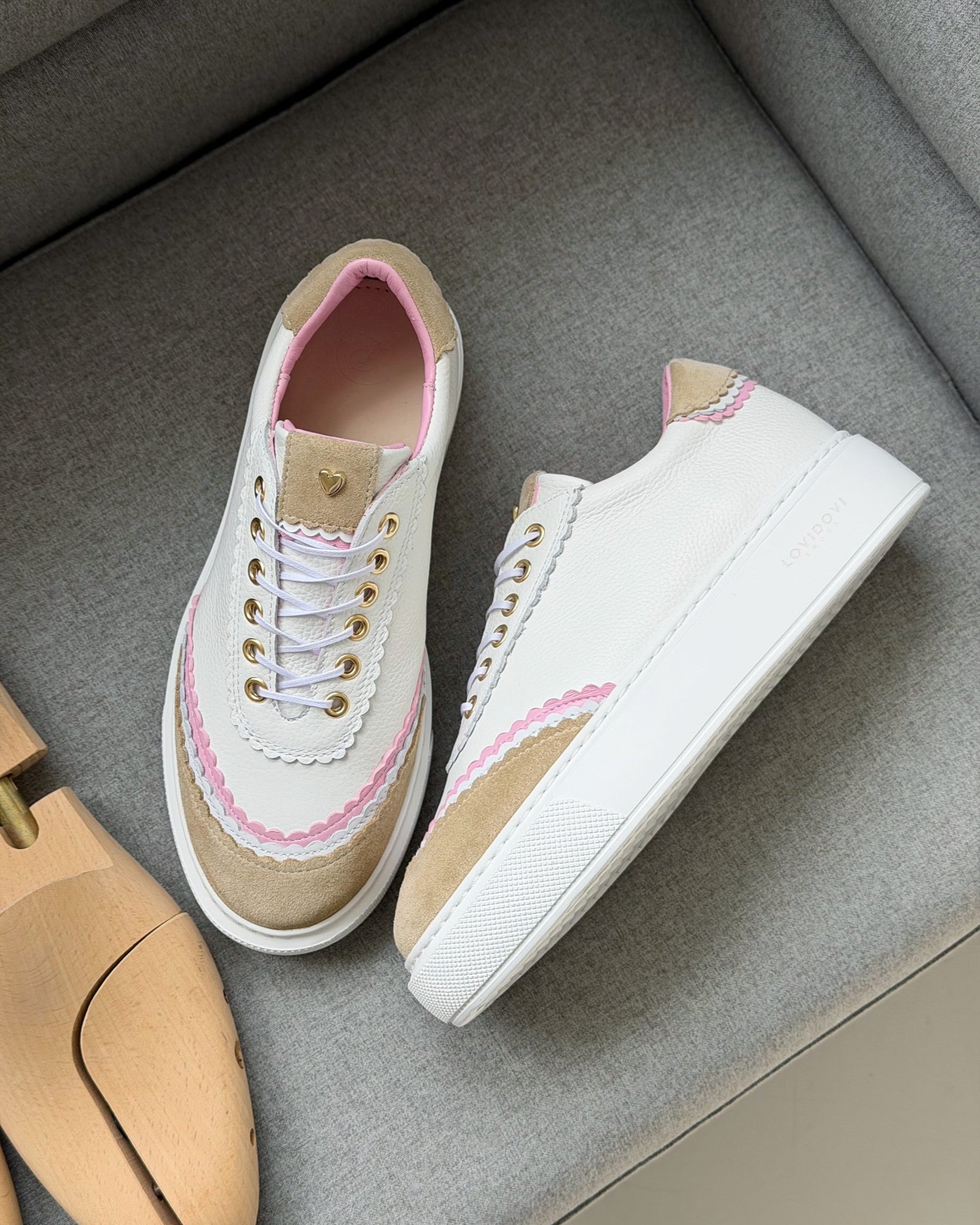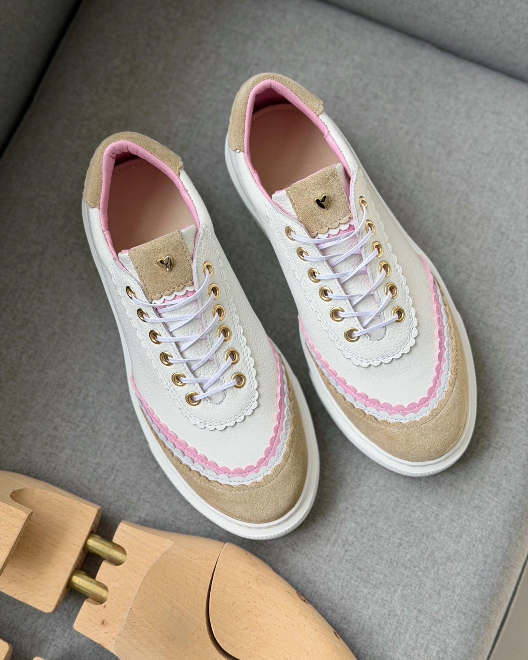 Jedes unserer Modelle verfügt über ein Herzdetail, das die Liebe und Mühe symbolisiert, die in die handgefertigte Herstellung jedes Paares investiert werden. Alle metallischen Herzdetails sind mit 24-karätigem Gold überzogen, was ihnen ein luxuriöses und elegantes Aussehen verleiht.
